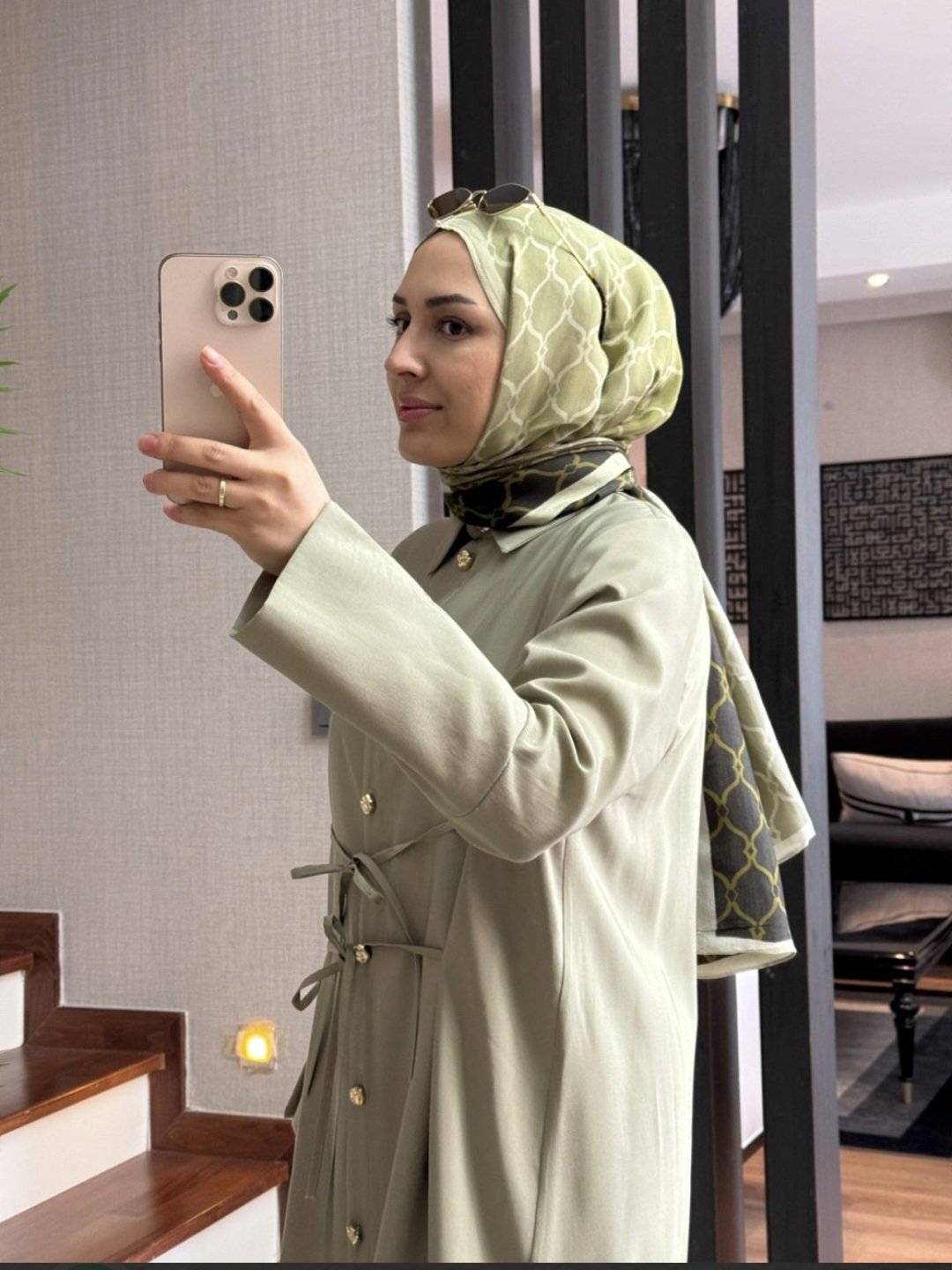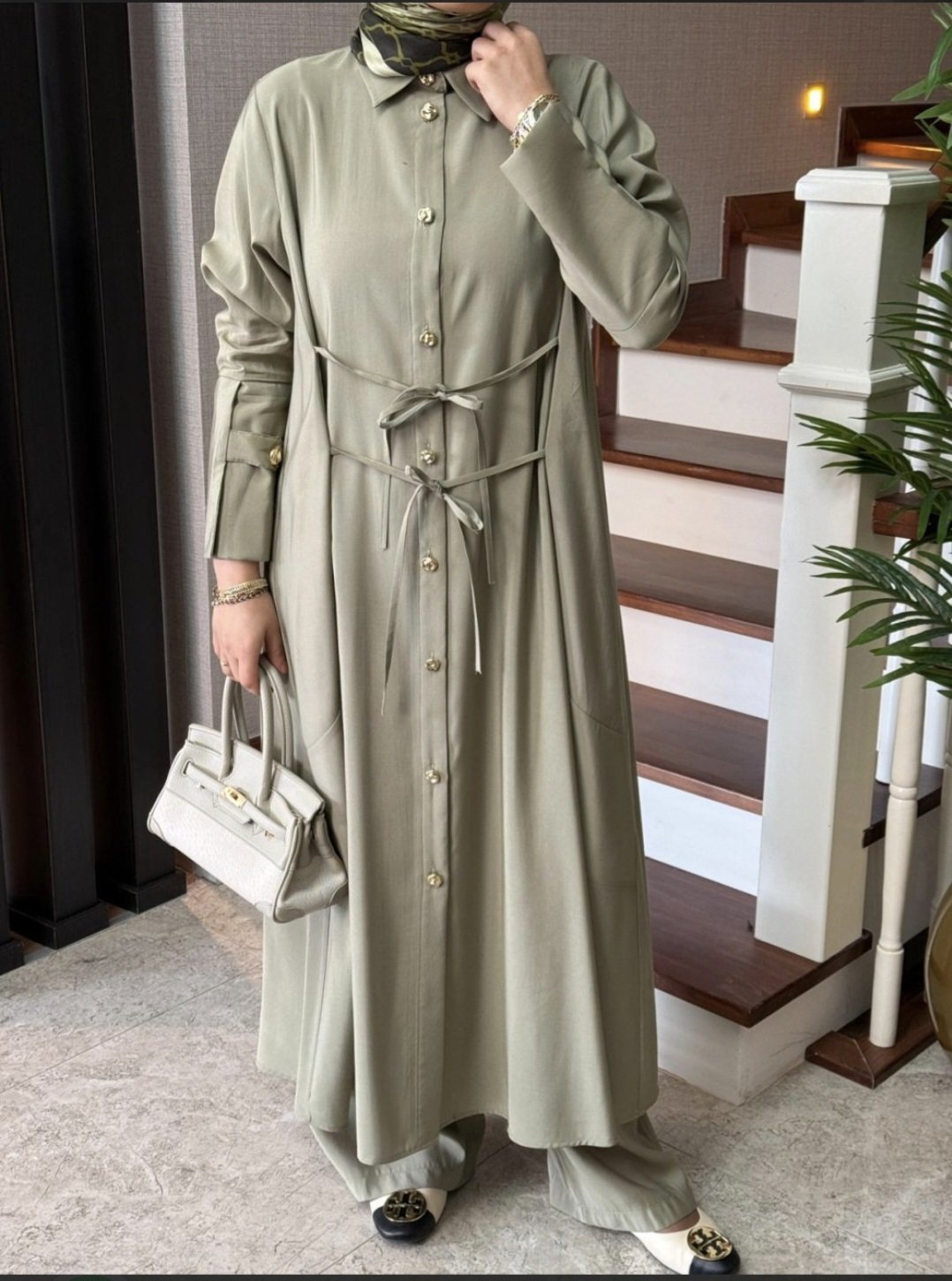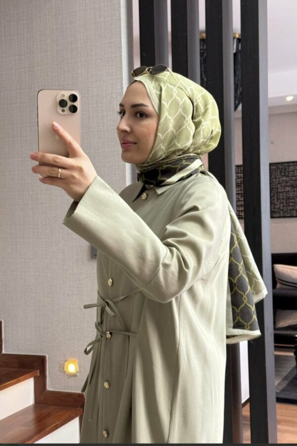 La tunique longue (125 cm) se distingue par ses détails raffinés avec boutons dorés à l’avant et aux poignets, apportant une touche chic.