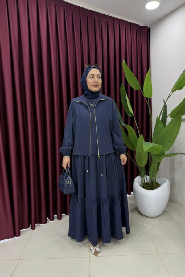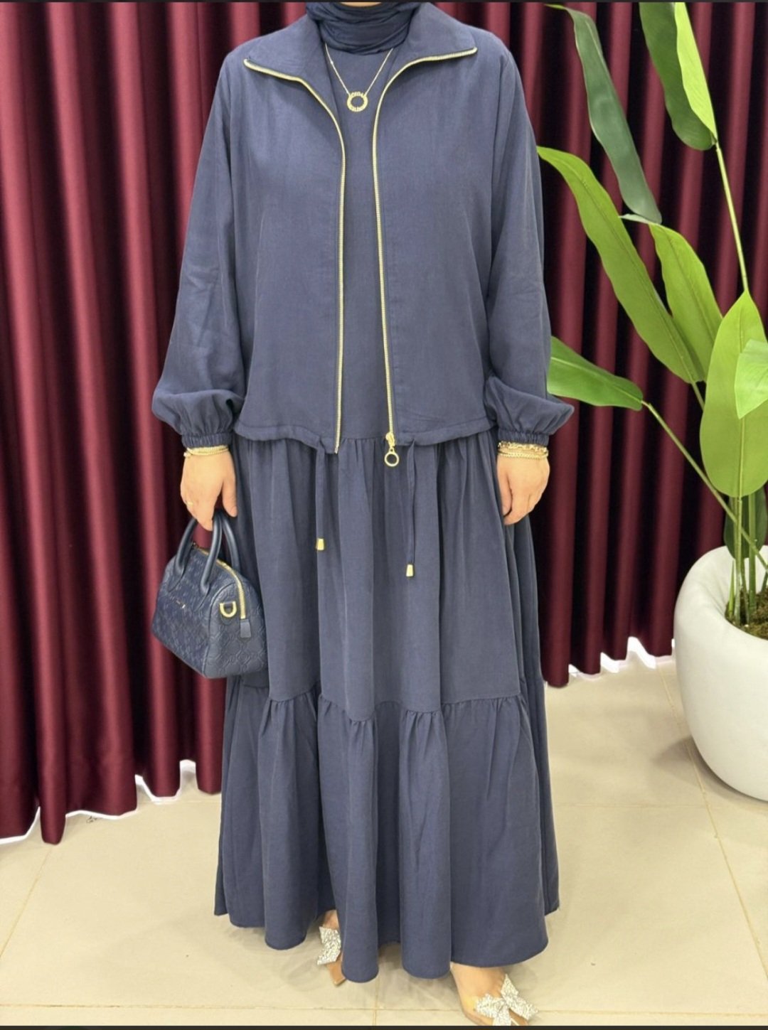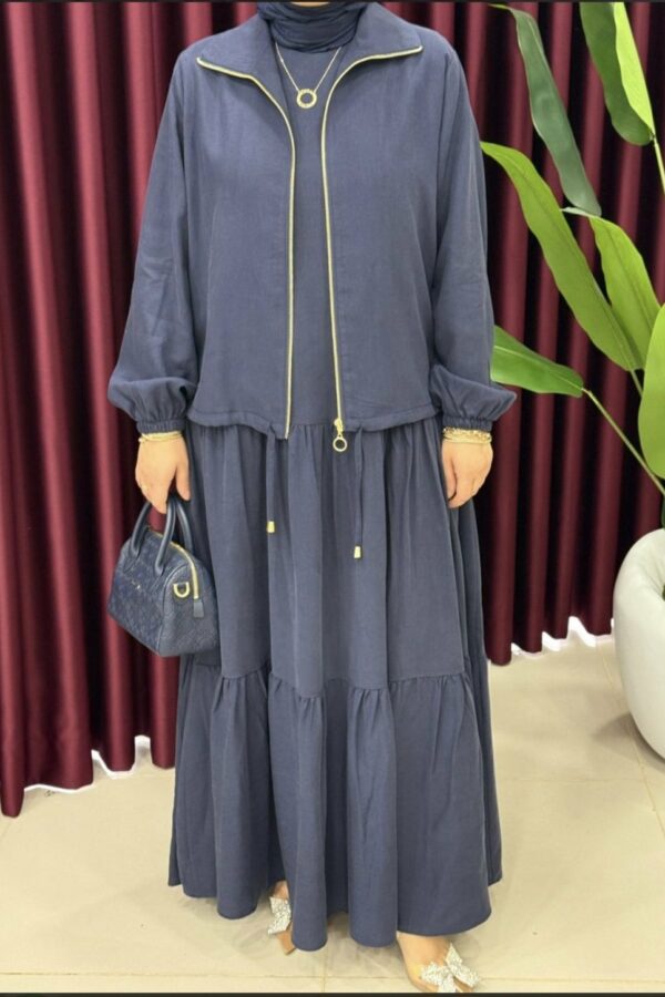 La veste (60 cm) se distingue par sa fermeture éclair dorée à l’avant, apportant une touche moderne.